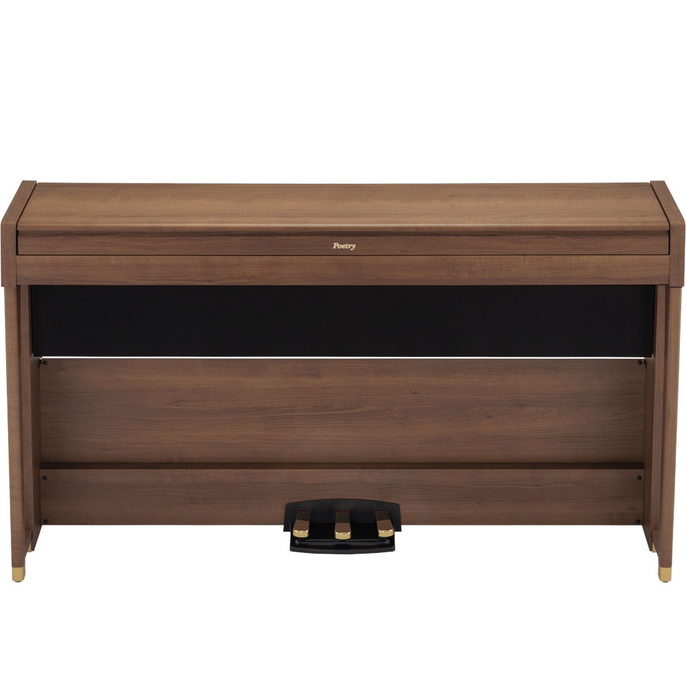 「Poetic Brown」と名付けた美しくエレガントな木目調の外観は、ショパンの纏う優しい雰囲気をイメージし、さらにペダルや足先にゴールドの装飾を入れ、上質な雰囲気に仕上げました。奥行きはわずか26センチ(※転倒防止金具除く)というスリムさを実現し、蓋を閉めるとフラットになる便利さも兼ね備えています。