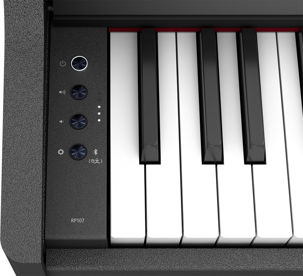 RP107はピアノらしい佇まいとコンパクトさを兼ね備えています。スリムなキャビネットは、アコースティック・ピアノと比べはるかに省スペースで、お部屋の模様替えの際など、移動させたいときも大人2人で動かすことができます。スライド式の蓋は開閉しやすく、使用していないときには鍵盤を保護してくれます。譜面台もついているので、楽譜はもちろん、スマートフォンやタブレットなど、モバイル端末の使用にも便利です。また、操作パネルも使いやすくシンプルな仕様となっています。